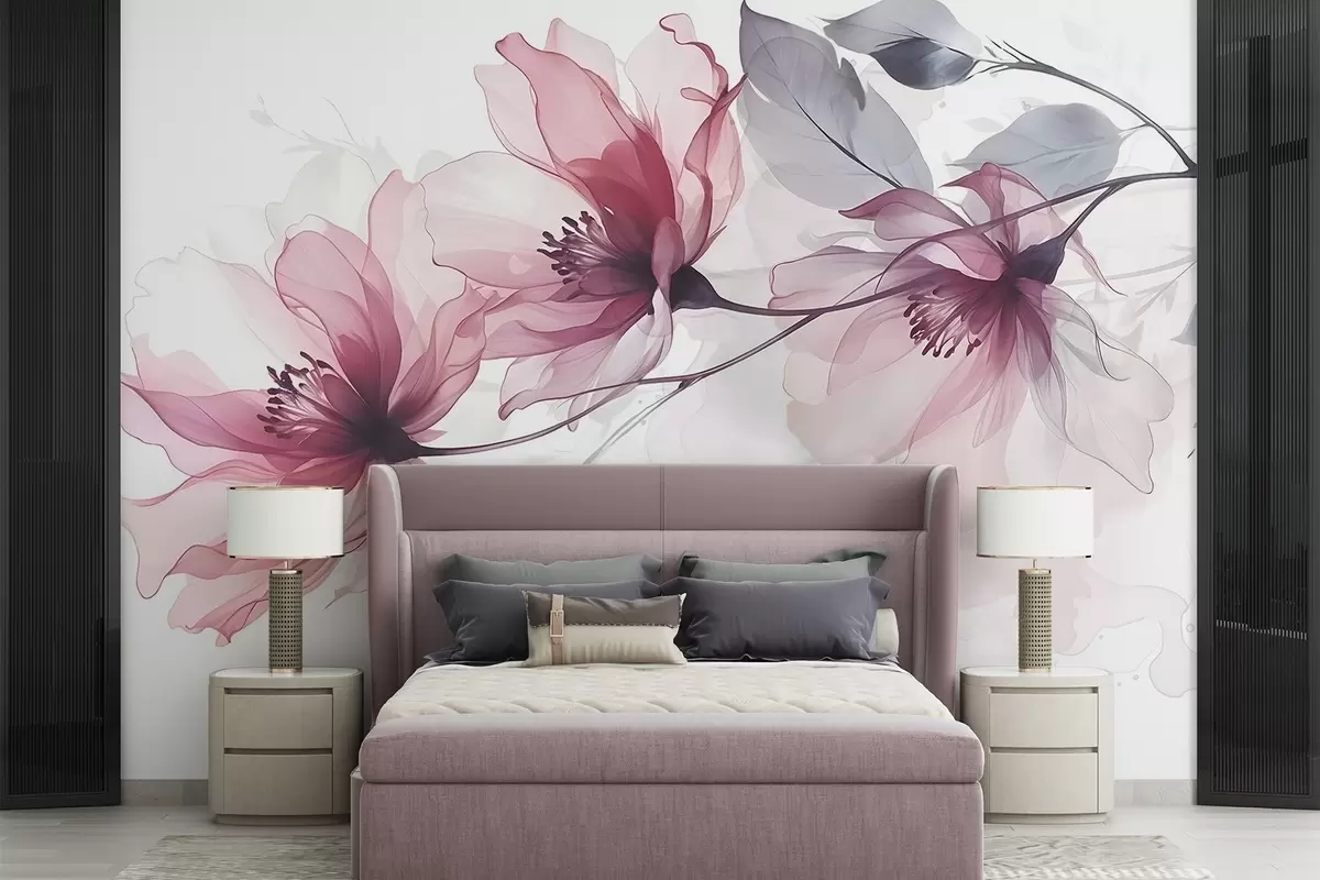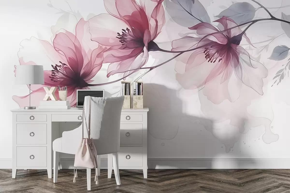 Wall murals Delicate transparent pink and gray flowers with soft, blurred petals on white background Nr. w08429