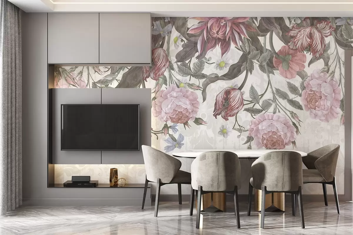 Wall murals A lush floral arrangement featuring large pink and white flowers, with green leaves and stems Nr. w08435