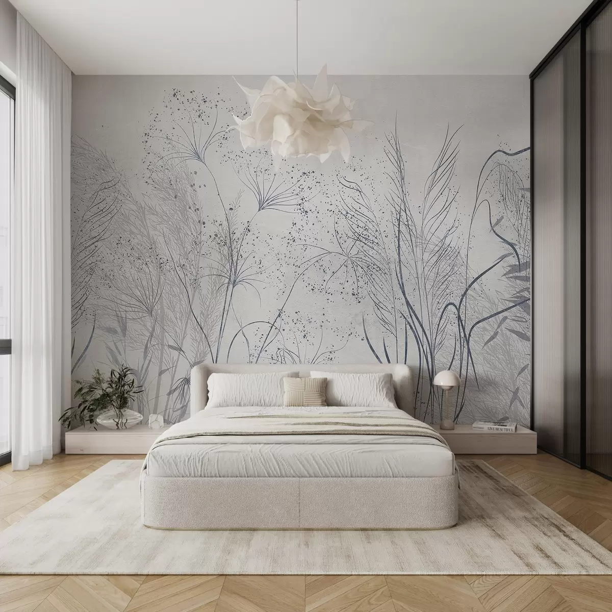 Wall murals A monochrome illustration of various gray plants and spikelets with delicate, wispy lines and textures Nr. w08441v1