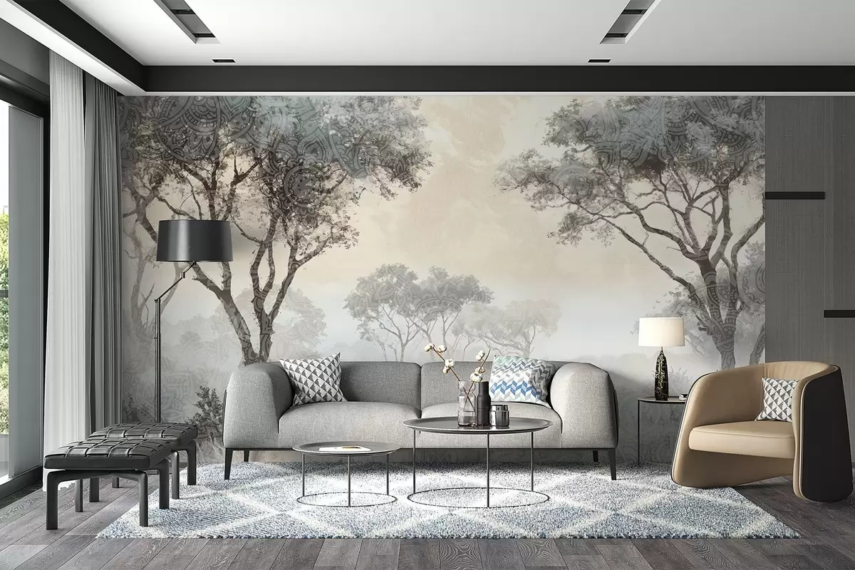 Wall murals A misty, serene landscape with silhouetted trees in the foreground with soft fog in shades of gray and beige Nr. w08442v1
