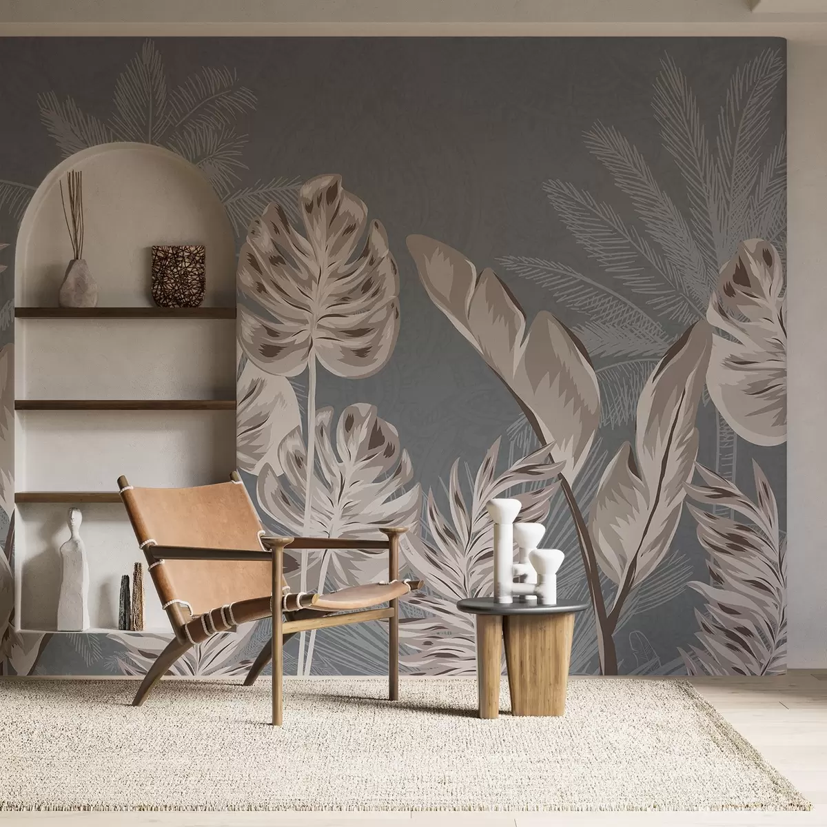 Wall murals Large, delicate beige leaves against a muted gray background , creating a serene and ethereal atmosphere Nr. w08449