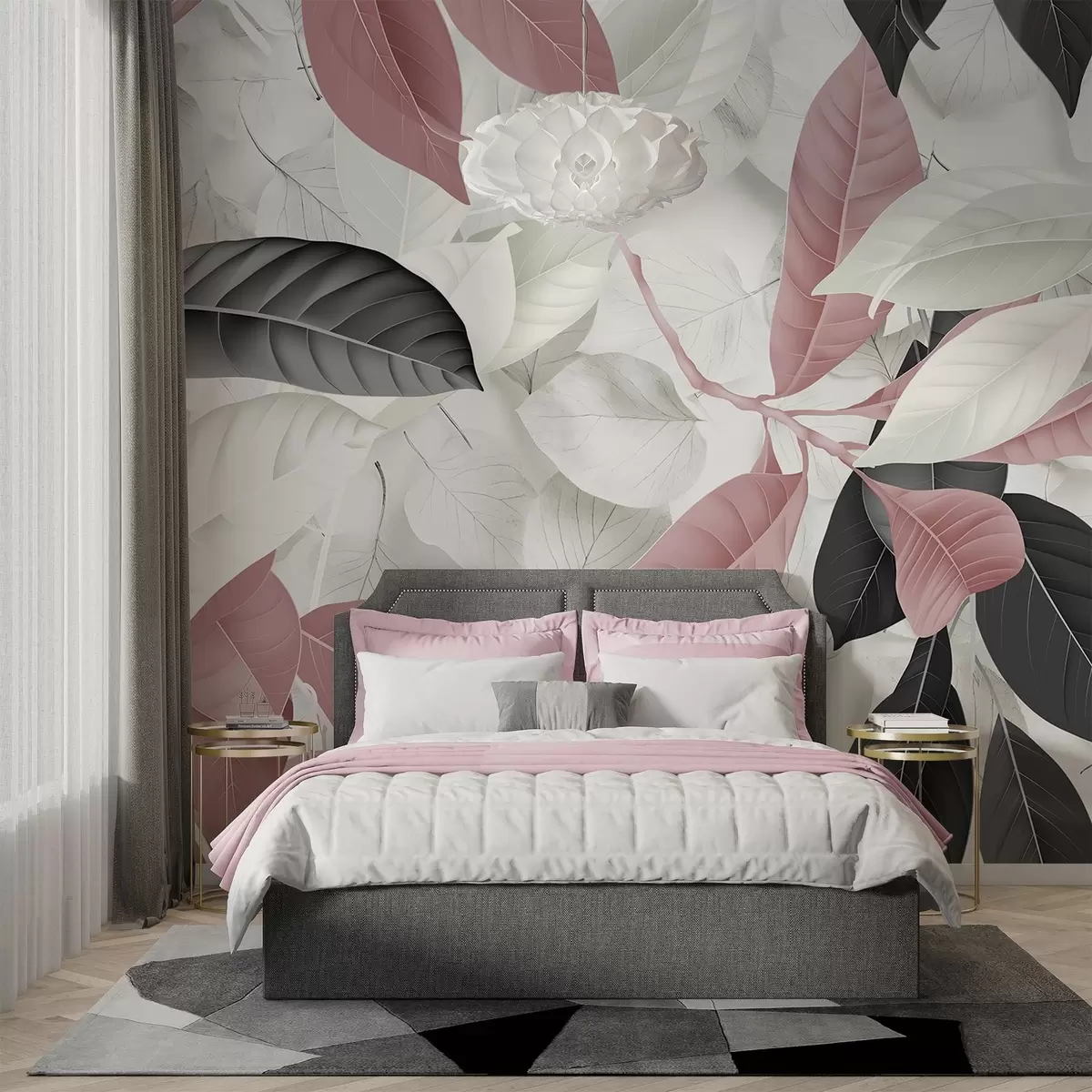 Wall murals Large print of pink and gray leaves against a light leaves textured background, creating a lush tropical feel Nr. w08468