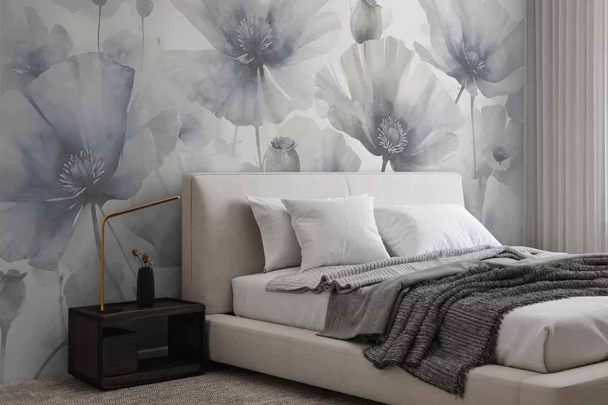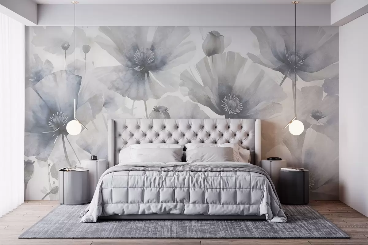 Wall murals Delicate textural grunge gray and white flowers with soft, blurred petals against a white background Nr. w08526