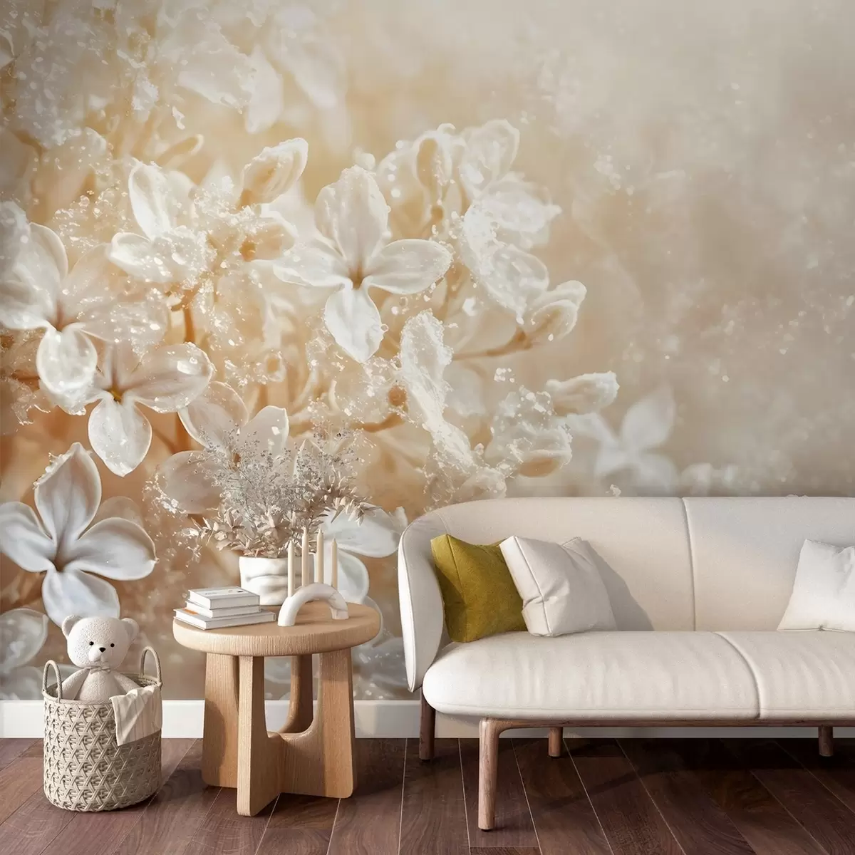 Wall murals Delicate white lilac flowers with soft, yellow blurred background Nr. w08533