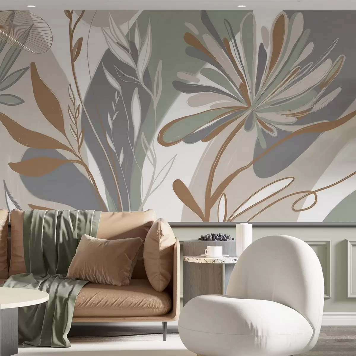 Wall murals Abstract floral minimalistic print with stylized leaves and petals in shades of green, gray, and beige Nr. w08536