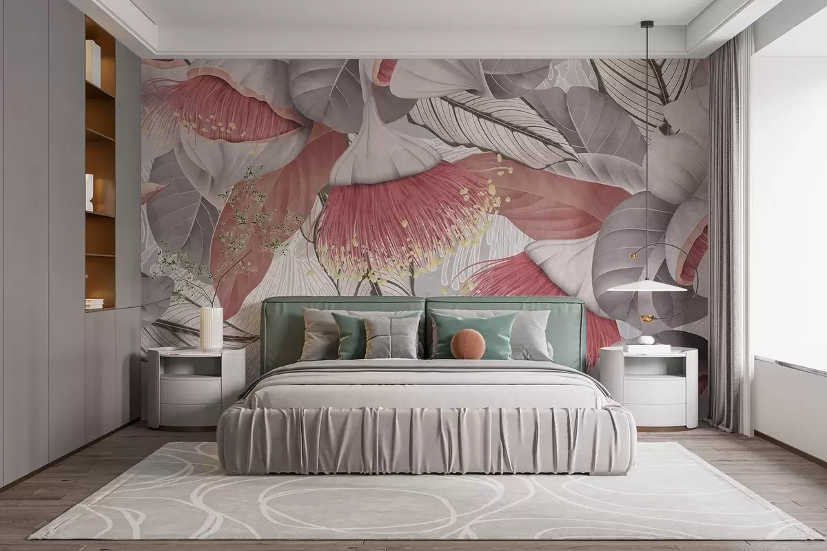 Wall murals Botanical illustration of large, eucaliptus flowers with long stamens against a gray and white background Nr. w08539