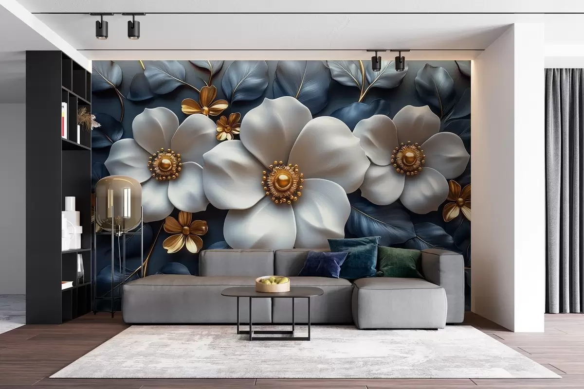 Wall murals Large white flowers on an elegant blue background with leaves Nr. w08559