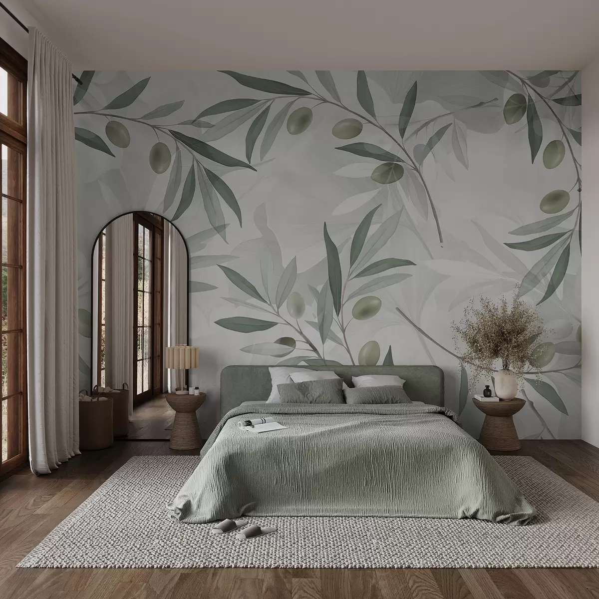 Wall murals Olive branches with green leaves and olives on a light background Nr. w08576