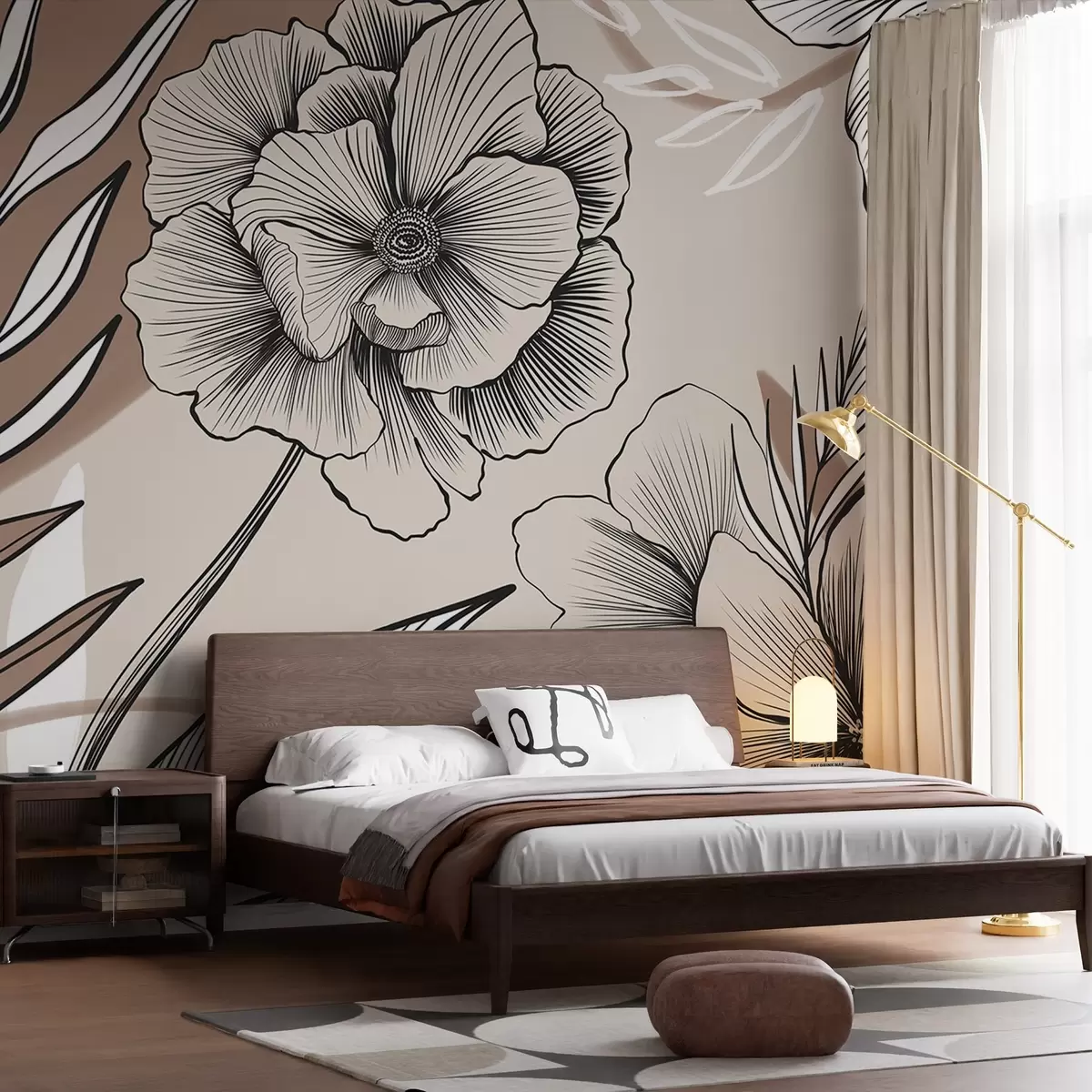 Wall murals Large black and white graphic flowers with detailed leaves on a beige abstract background Nr. w08580