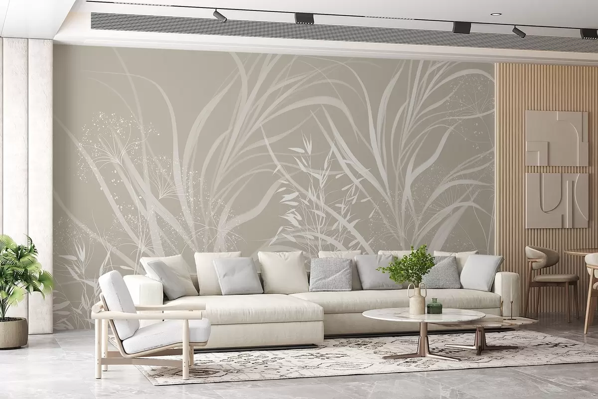 Wall murals Delicate modern minimalistic white floral print on a light pastel-beige background Nr. w08583