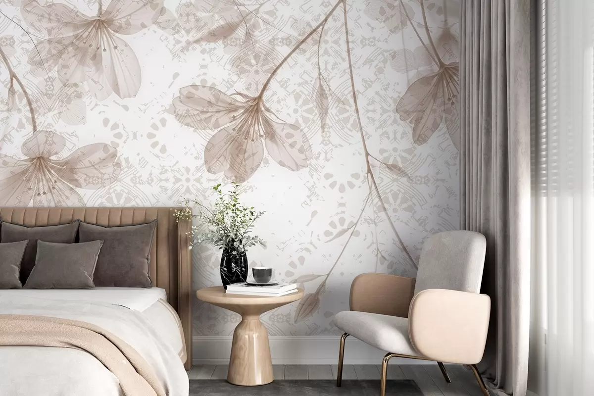 Wall murals Delicate beige and white flowers with long stems and petals against a soft, blurred textural background Nr. w08588v1