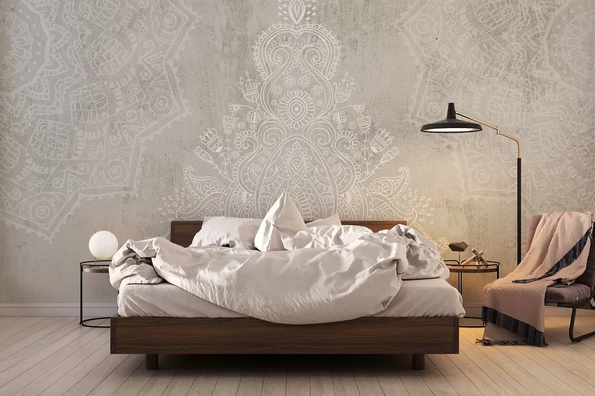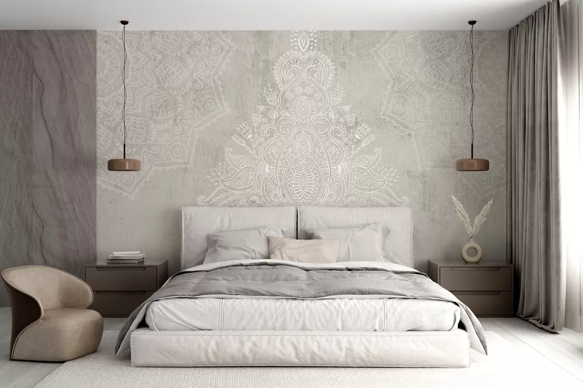 Wall murals A detailed, intricate white lace mandala print on a light beige textured abstract background Nr. w08614