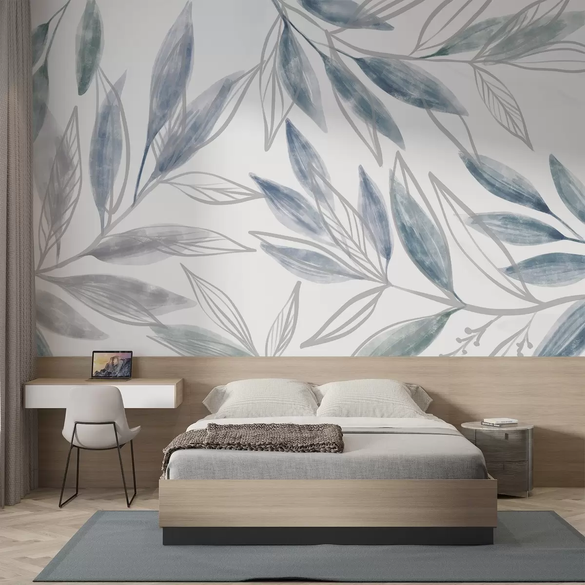 Wall murals Delicate blue and gray textured pastel leaves , creating a serene and minimalist botanical composition Nr. w08642v1