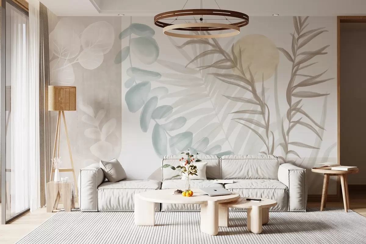 Wall murals A minimalist abstract print with stylized leaves and eucaliptus with soft, beige organic shapes in muted pastel colors Nr. w08648
