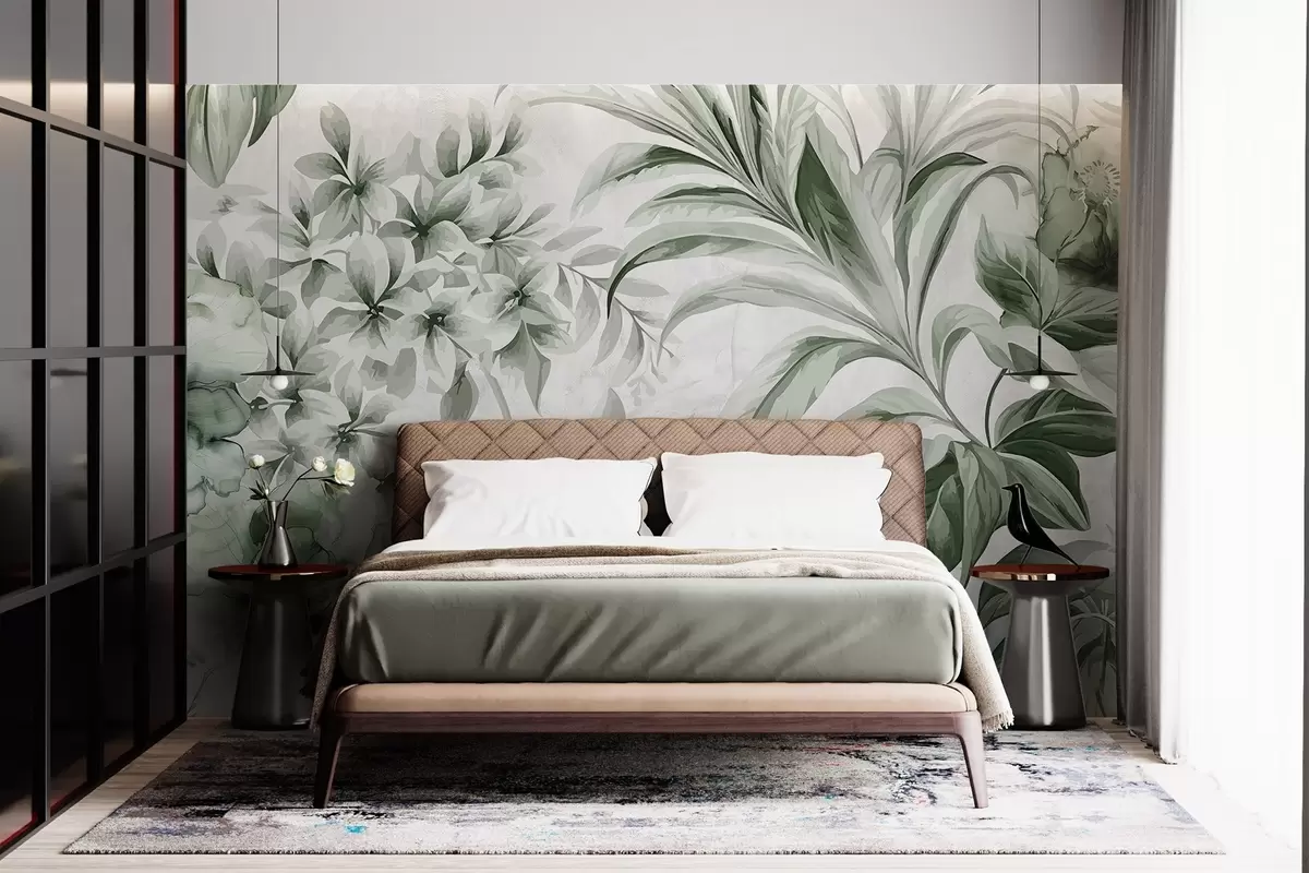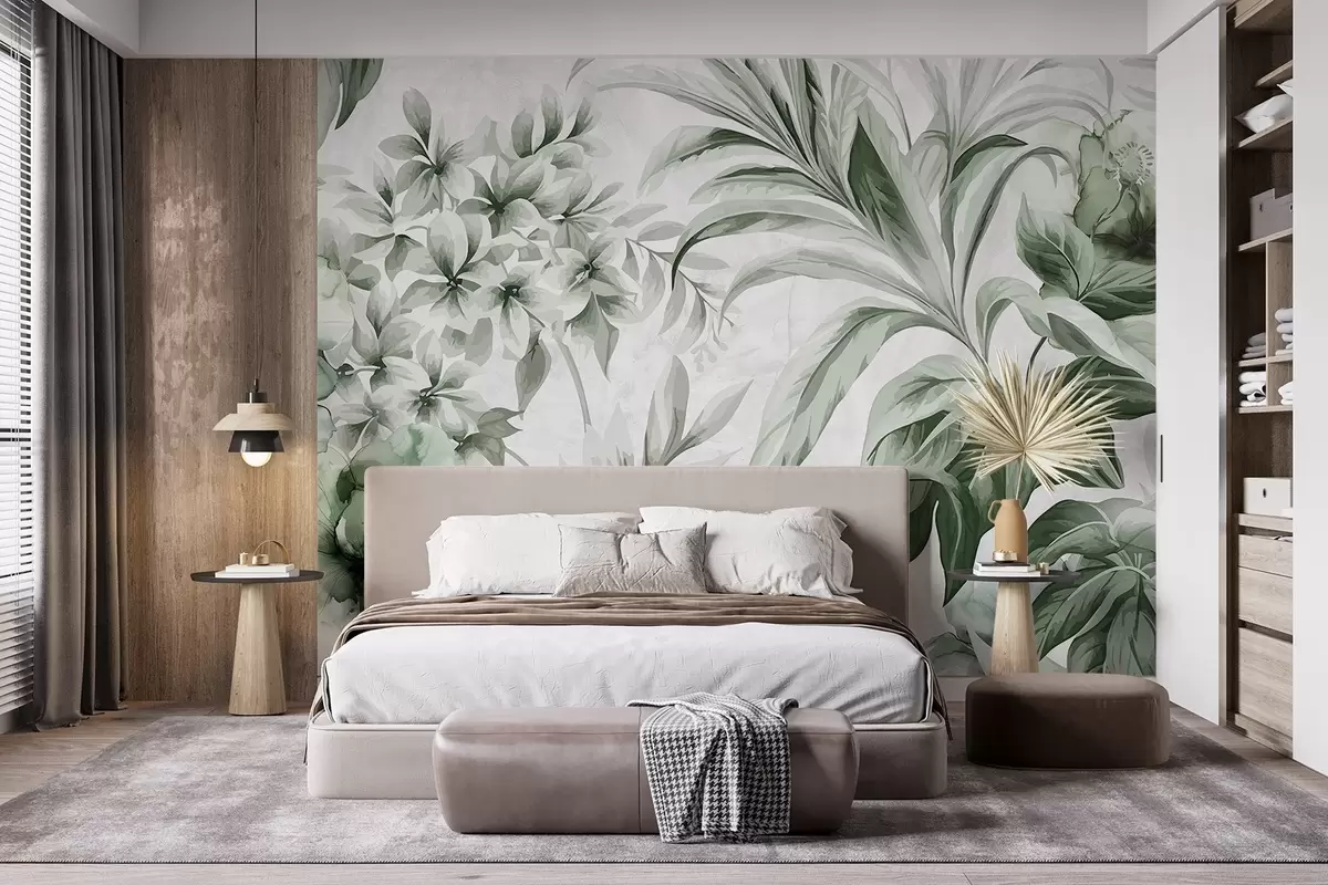 Wall murals Tropical leaves and foliage in a muted palette ranging from light to dark shades of green on textured light background Nr. w08650