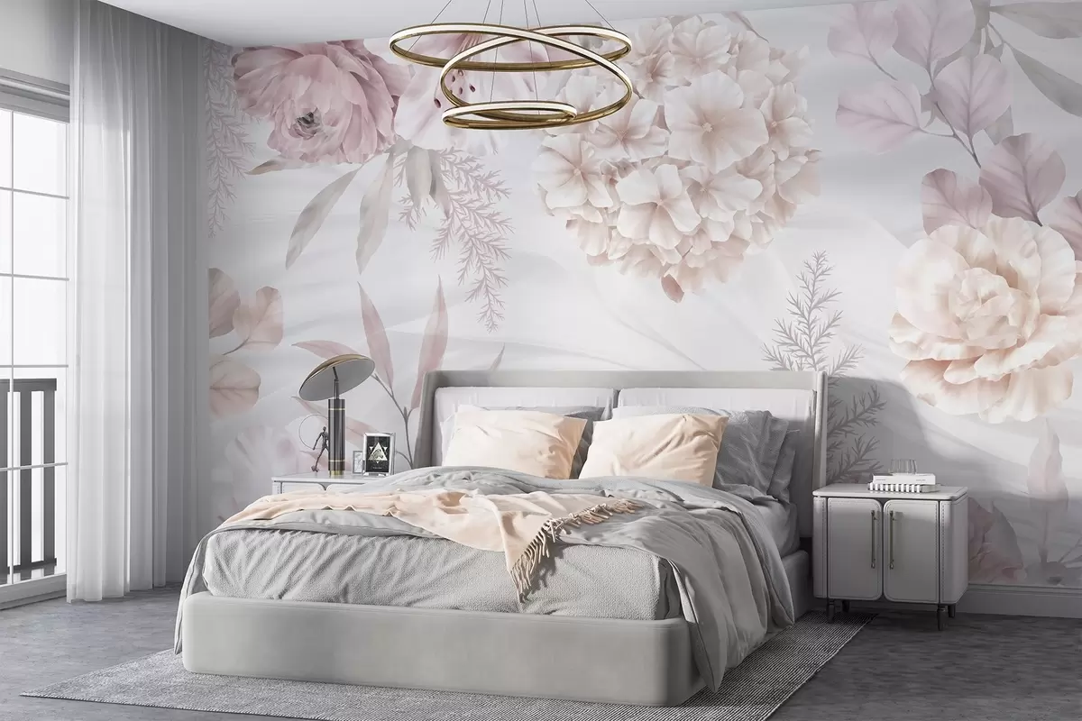 Wall murals A soft, abstract floral print with large pink and white flowers, delicate leaves, and a muted, pastel color palette Nr. w08651