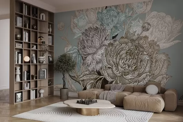 Wall murals A detailed floral line design featuring large peonies and leaves in shades of blue, beige and brown Nr. w08663