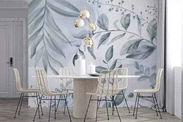 Wall murals Botanical print with leaves and floral branches in soft pastel colors, on watercolor-like background Nr. w08668v1