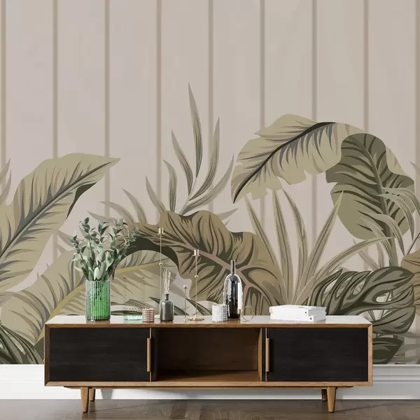 Wall murals Tropical foliage pattern in muted green and beige tones on a light background with vertical lines Nr. w08683