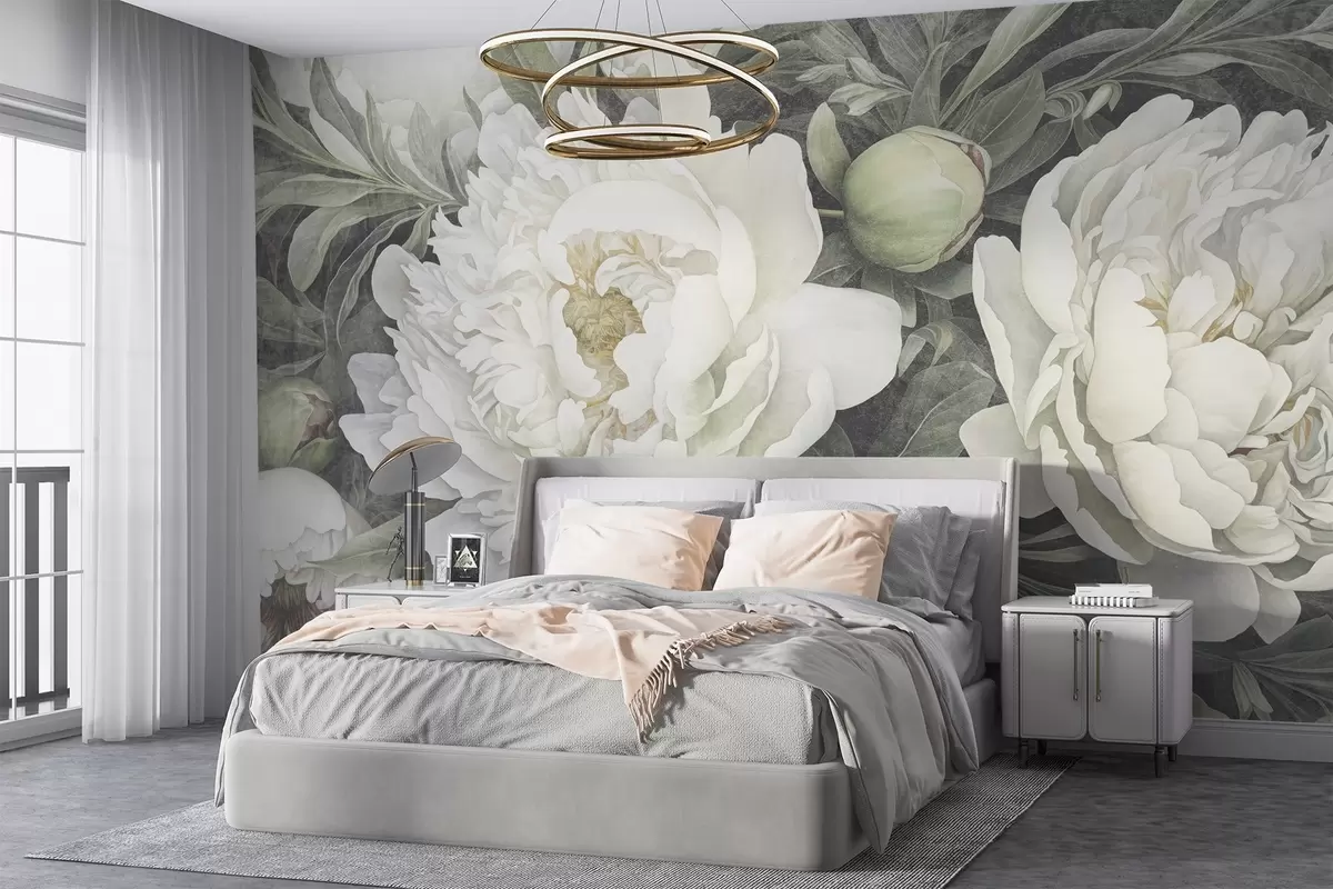 Wall murals Textured pastel white peonies with soft green buds and leaves with delicate petals Nr. w08697