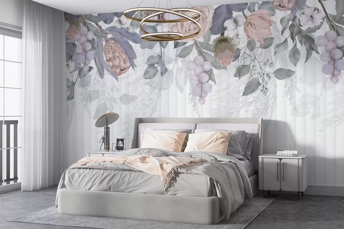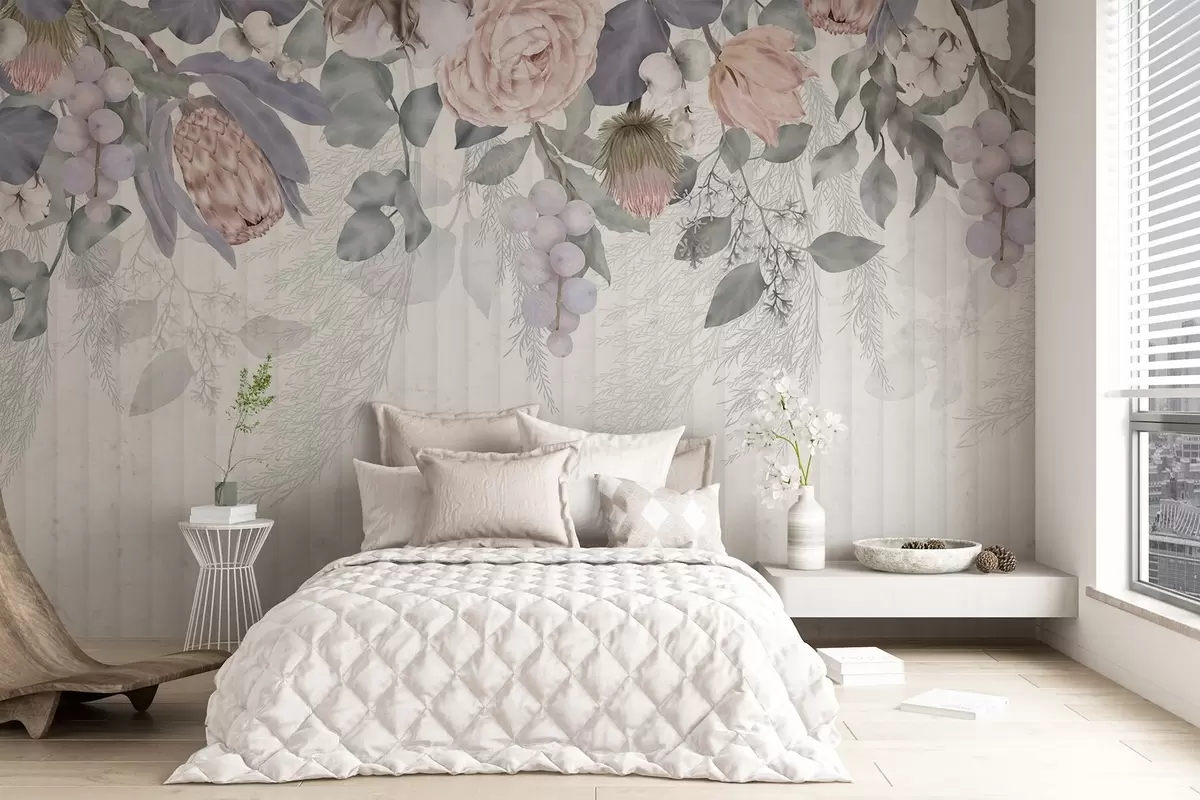 Wall murals A floral pastel-colored pink roses, protea flowers, eucalyptus branches and berries on textured background Nr. w08700