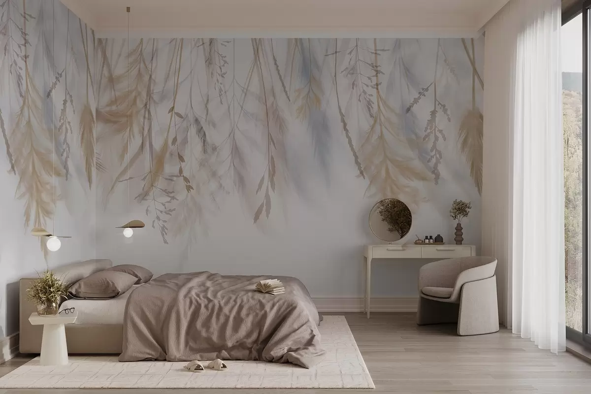 Wall murals Delicate grasses, spikelets and plants in pastel tones, arranged in a cascading print against a pale background Nr. w08737