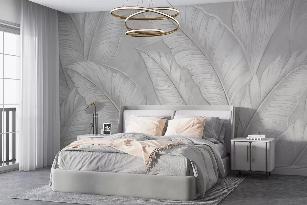 Wall murals Highly-textured detailed large tropical leaves in a monochromatic light gray color in loft style Nr. w08772