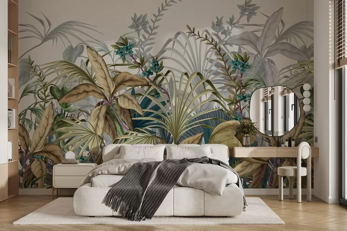 Wall murals Arrangement of various tropical plants with large vibrant leaves, creating a lush foliage scene on a light beige Nr. w08777v1