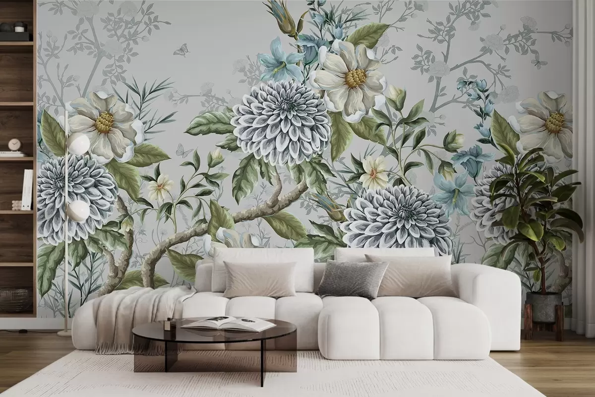 Wall murals A floral print featuring chrysanthemums, delicate blue flowers, and green leaves intertwined with branches Nr. w08782
