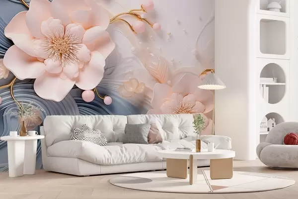 Wall murals 3D background design with pink flowers and pearls against blue and white waves Nr. w08806