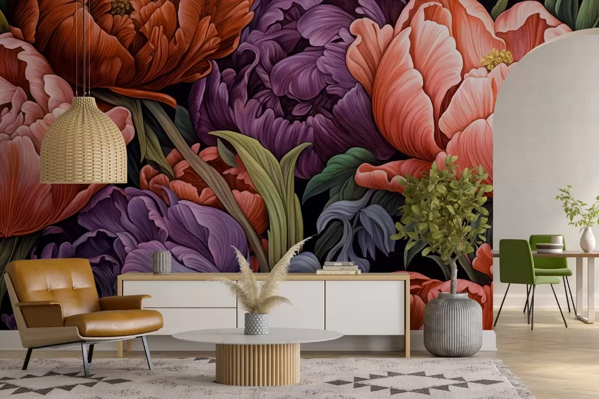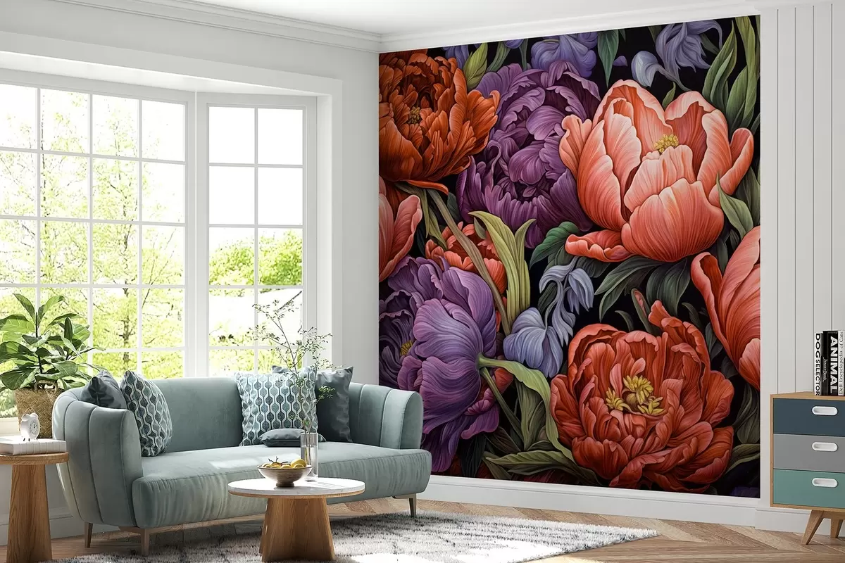 Wall murals Tulips and peonies in a Victorian style, in red and purple colors Nr. w08818v1