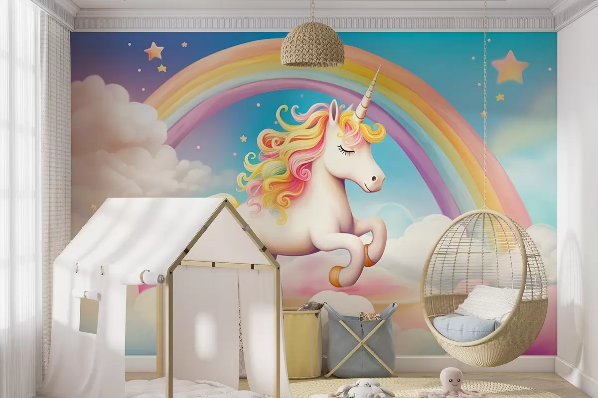 Wall murals A unicorn horse with a rainbow, clouds, and a starry sky Nr. w08820