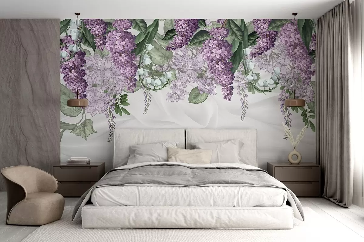Wall murals Pastel lilac flowers and green leaves on a white background with imitation silk fabriс texture Nr. w08825