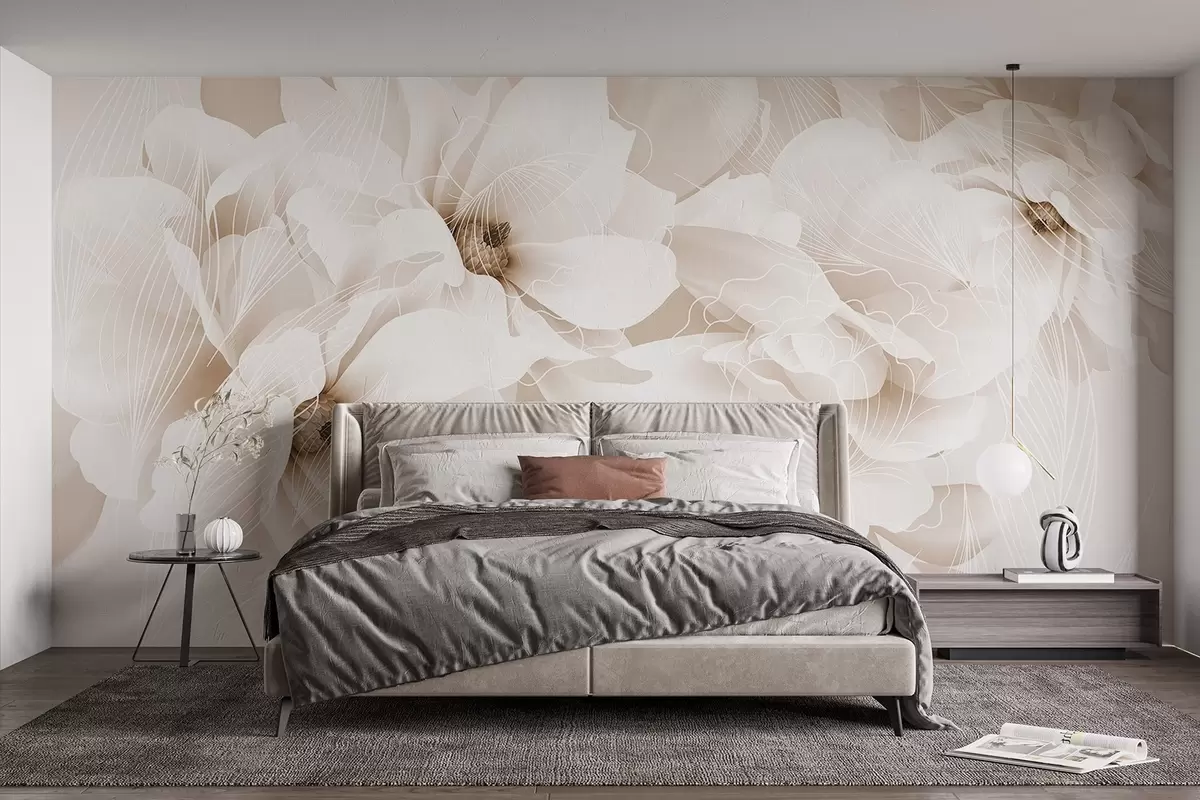 Wall murals Pastel peony flowers with white and beige delicate petals and white lines on a light beige background Nr. w08826v1