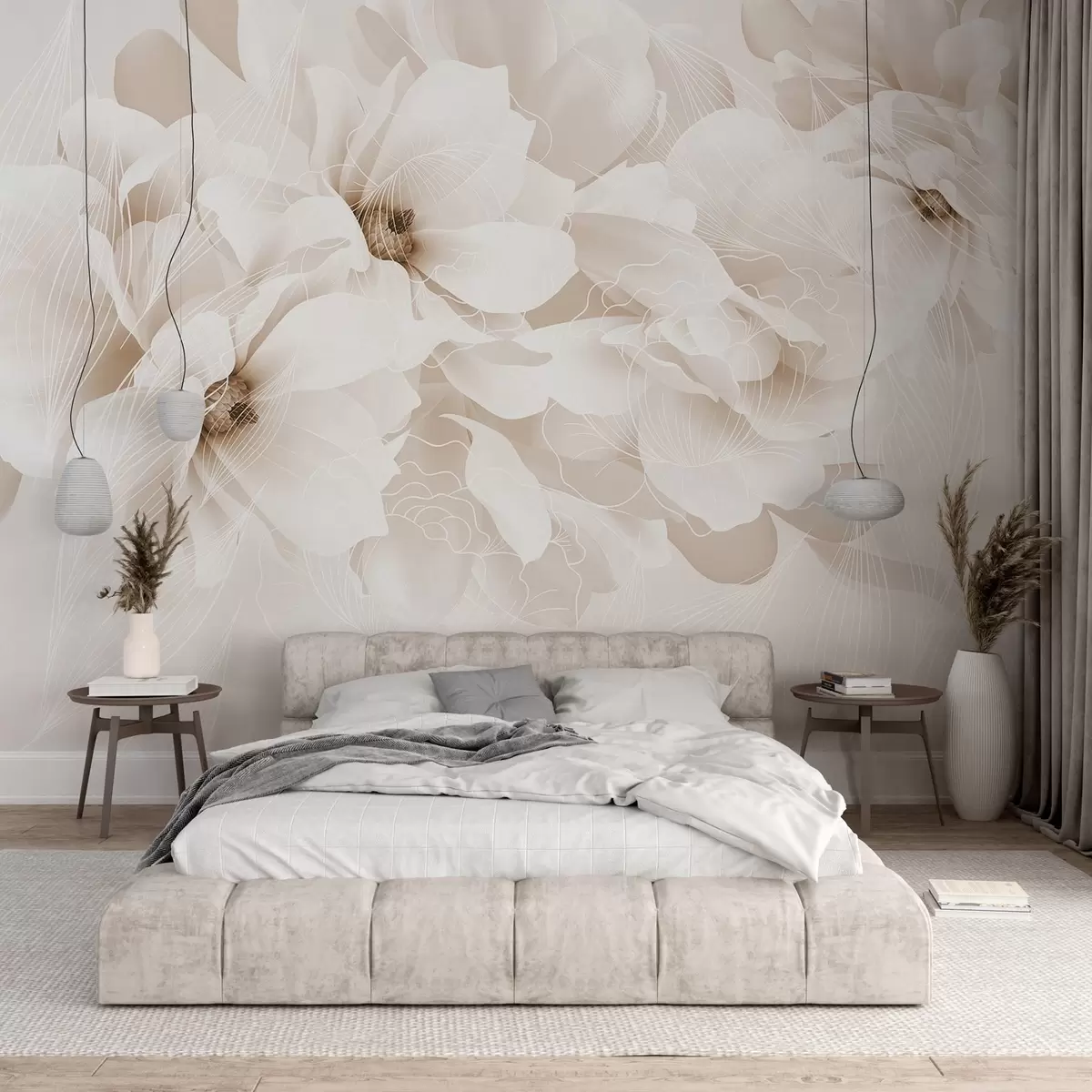 Wall murals Pastel peony flowers with white and beige delicate petals and white lines on a light beige background Nr. w08826v1