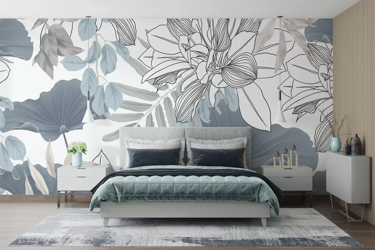 Wall murals Floral print with lotus flowers and leaves in blue and white on a white background Nr. w08827