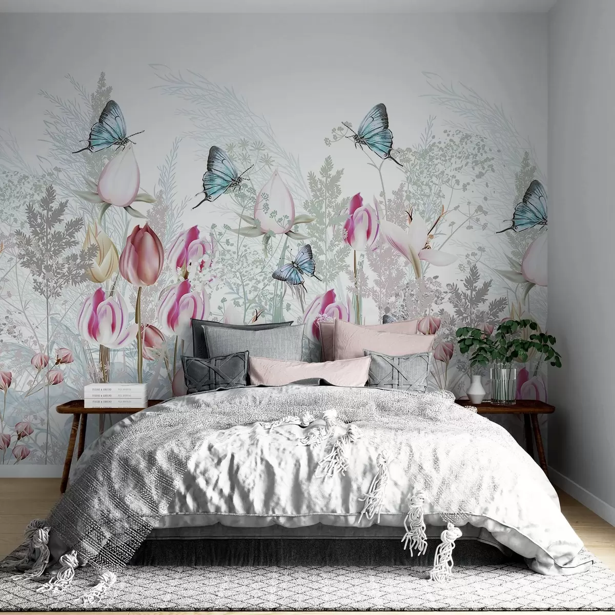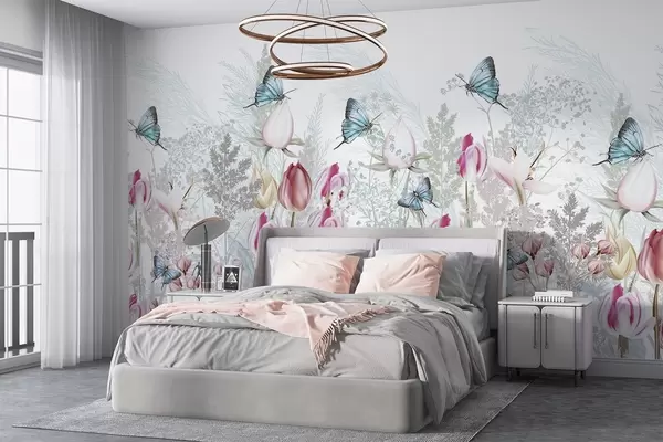 Wall murals Pastel print with tulip flowers, grass and butterflies flying in a garden Nr. w08834