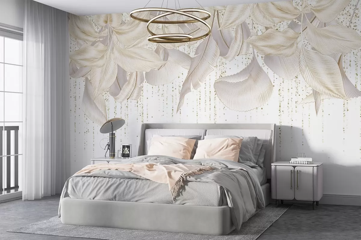Wall murals White detailed tropical leaves and yellow dotts texture on a white background Nr. w08836