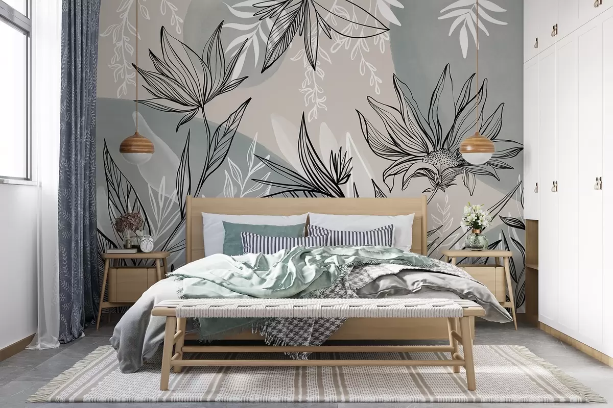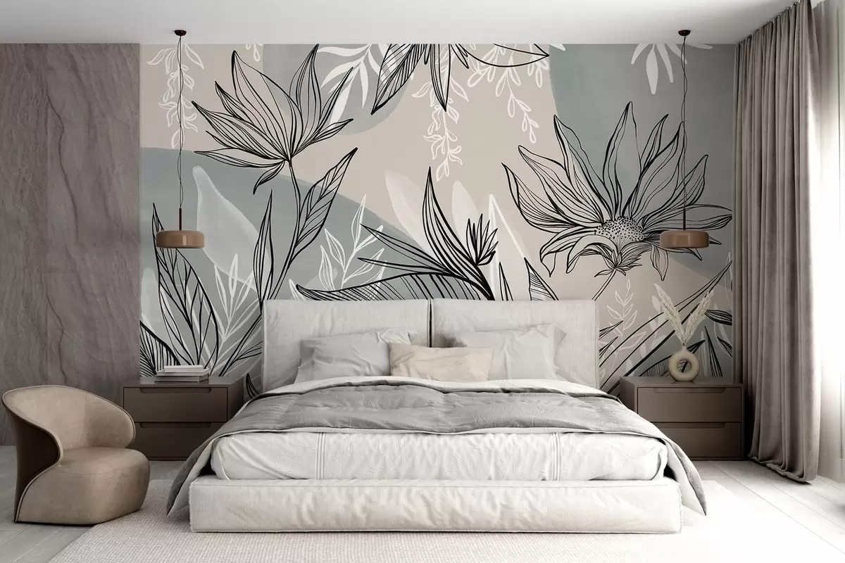 Wall murals Floral line art with large leaves and flowers, against a background of beige and blue watercolor washes Nr. w08865