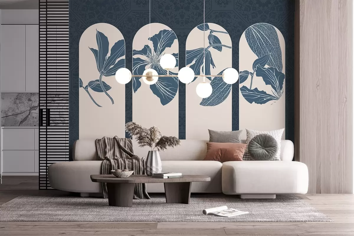 Wall murals Elegant arches with floral designs in dark blue and white, against a textured beige background, minimalist style Nr. w08866v1