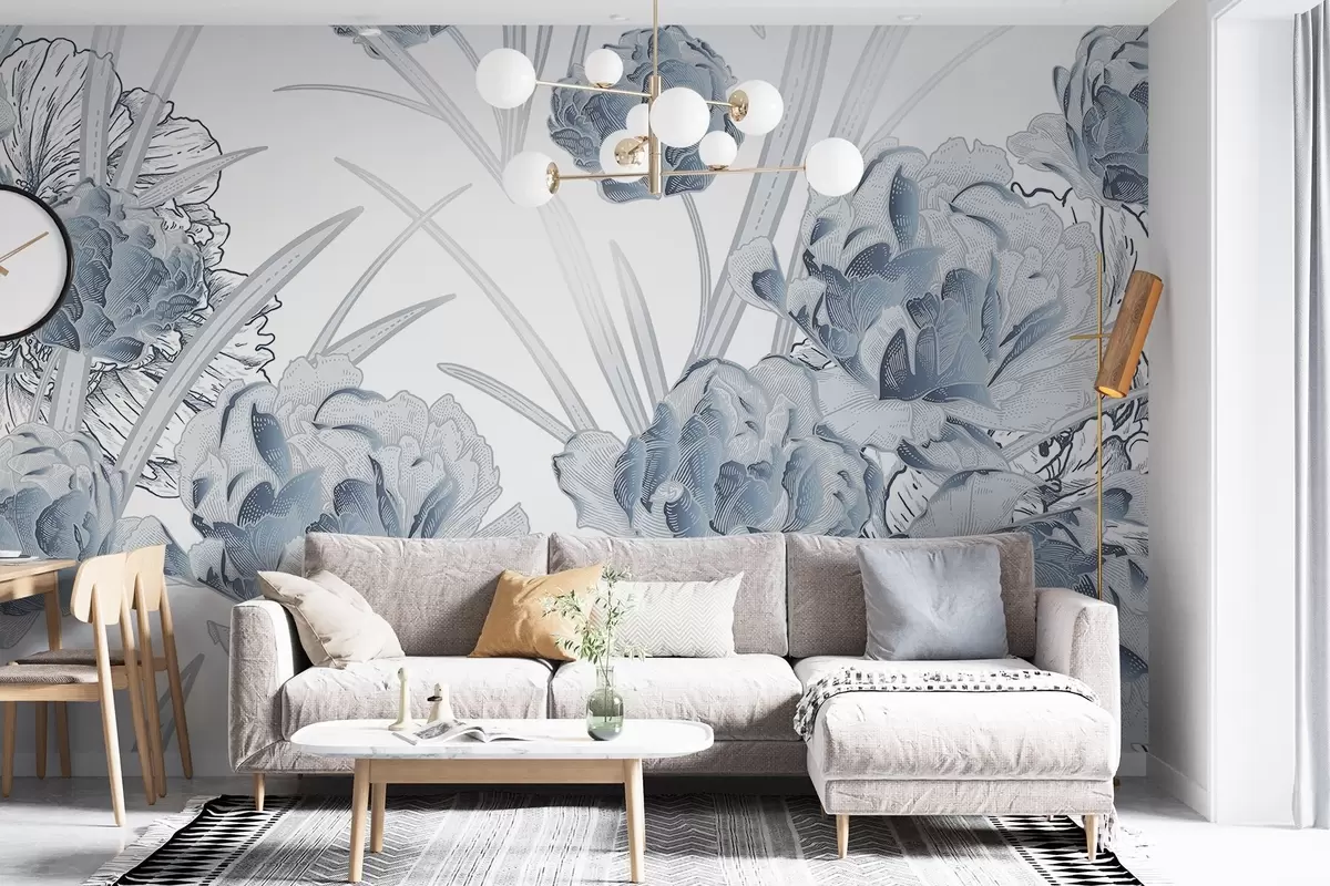 Wall murals Blue peonies with leaves on a white background, floral design, botanical illustration Nr. w08896