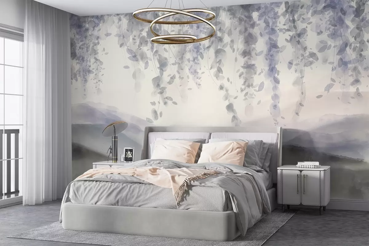 Wall murals Wisteria leaves hanging over blured mountains, soft pastel blue and gray colors, watercolor style landscape Nr. w08909