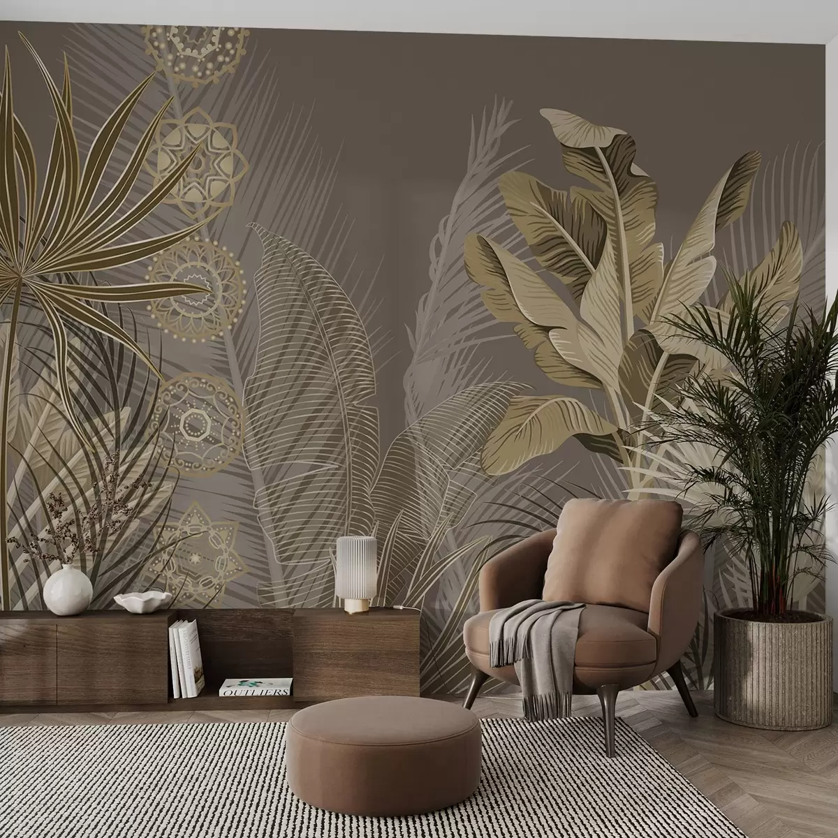 Wall murals Tropical leaves in beige and brown tones, palm leaves, banana leaves and mandala ornaments, dark background Nr. w08913v1
