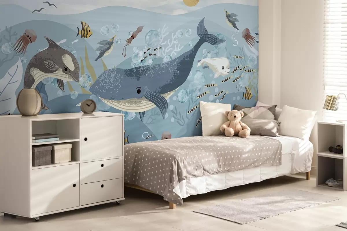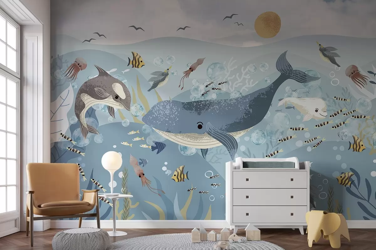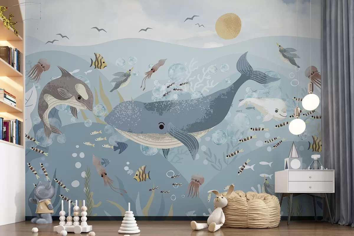 Wall murals Kids illustration cute print with blue whale surrounded by fish, squids, jellyfish in a blue ocean with bubbles Nr. w08921
