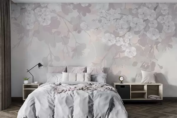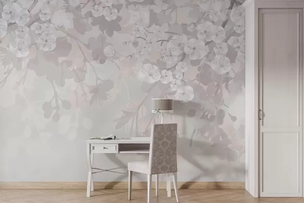 wall murals Cherry blossom branches with white flowers and grey leaves, on elegant floral silhouettes in soft pastel colors w08973v1