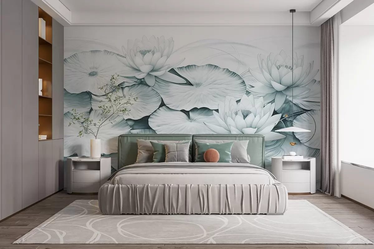 Wall murals Water lilies and lily pads in a pond, turquoise and white imitation of pencil drawing, detailed botanical illustration, nature art Nr. w09006v1