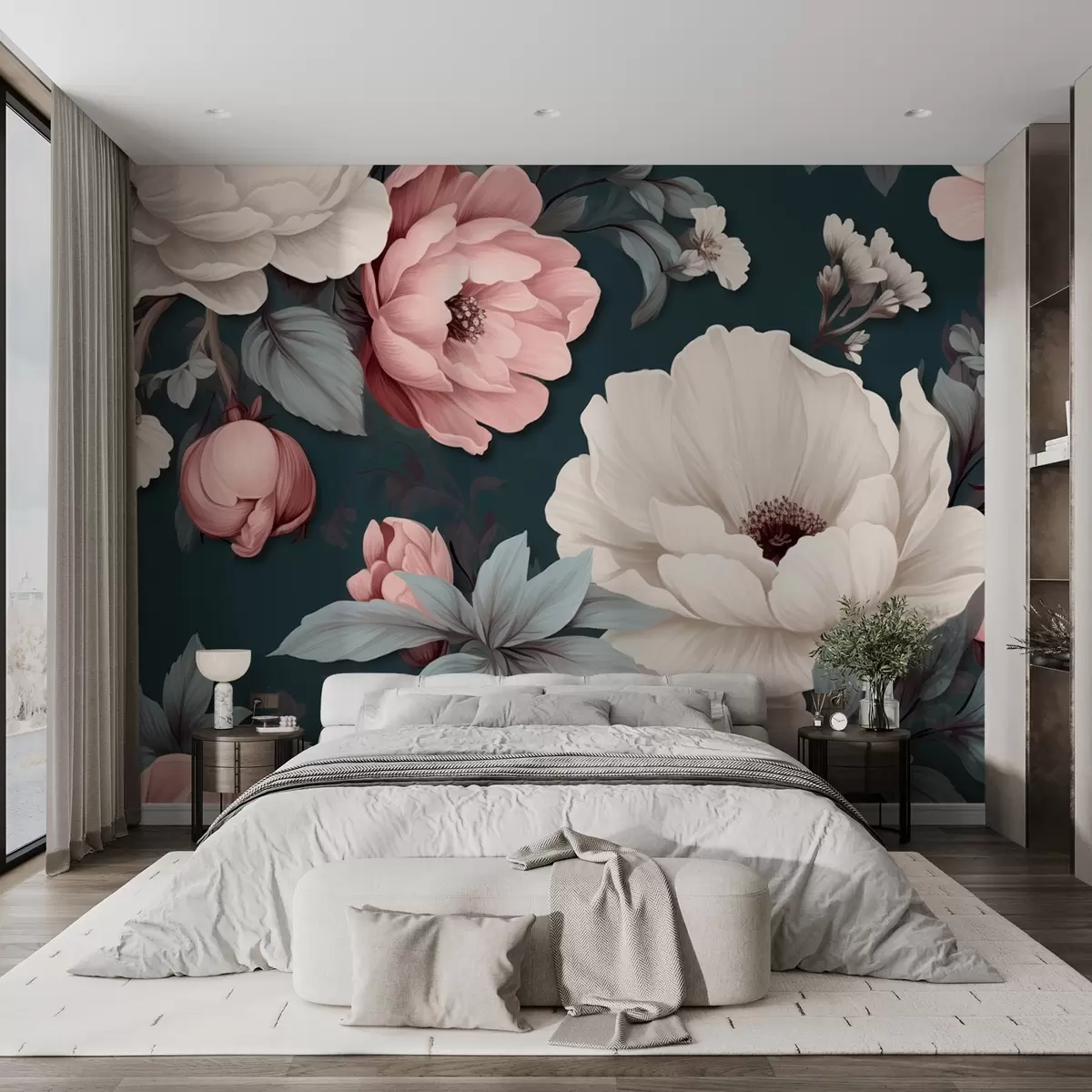 Wall murals White and pink peonies on a dark blue background Nr. w09017