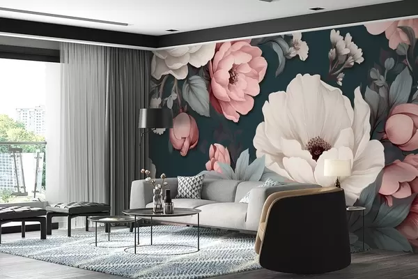 Wall murals White and pink peonies on a dark blue background Nr. w09017