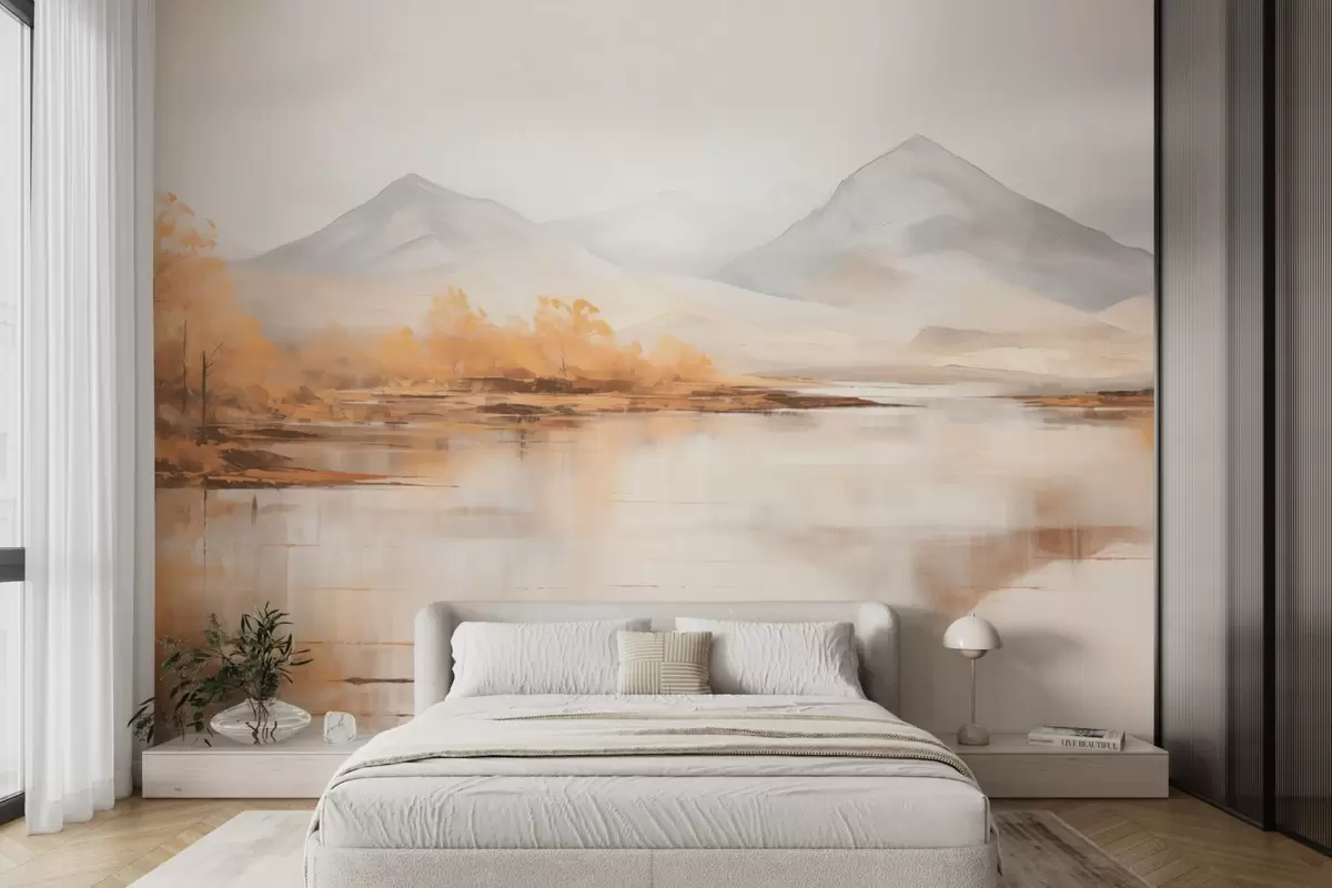 Wall murals Autumn landscape with yellow trees and a river against a mountain backdrop Nr. w09020