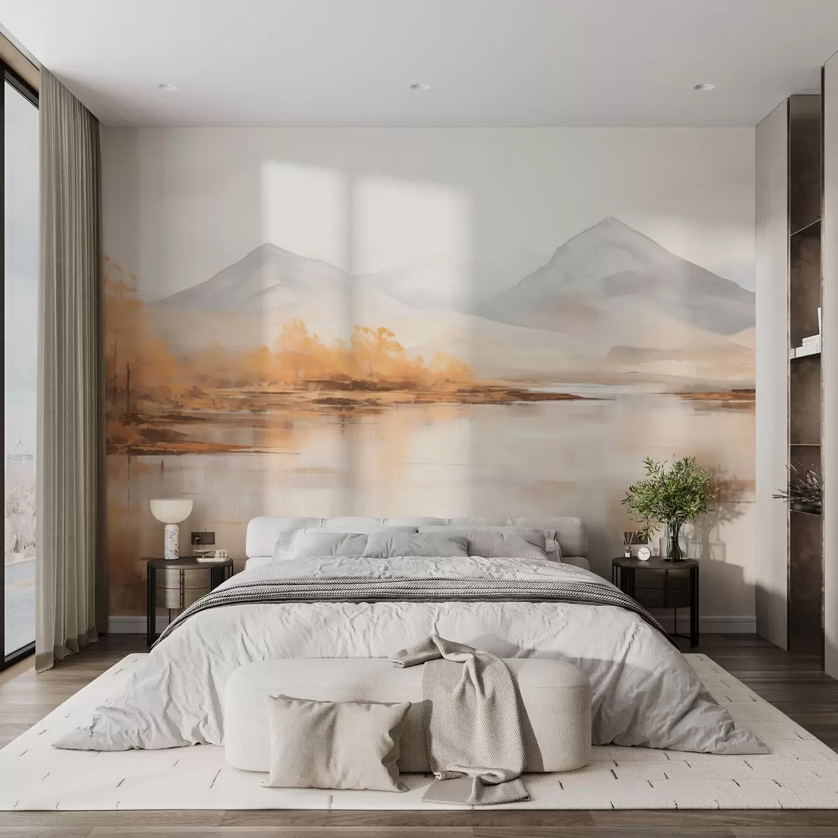 Wall murals Autumn landscape with yellow trees and a river against a mountain backdrop Nr. w09020